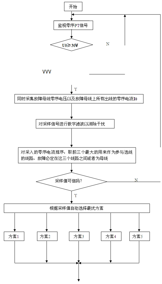 當被測系統發生單相接地且零序電壓達到整定值(可在5V~100V之間任意選取,一般選為30V)時,裝置將啟動選線程序(見圖一)并將所有被測線路的零序電流和故障母線電壓同時采集進來,然后進行數字濾波以消除干擾。因為故障線路的零序電流為非故障線路零序電流之和。所以,理論上故障線路的零序電流采樣值應為****。但由于CT誤差、信號干擾以及線路長短差別懸殊等原因,故障線路的零序電流采樣值在排序時可能不在第一位,但不會超出前三位。因此在第一步排序時采用“相對幅值”原理取前三個****的。然后利用“相對相位”概念,即各電流之間的方向或電流與電壓之間超前與滯后關系進一步確定前三個之中的哪一個為 故障線路,或者是母線故障。由于采用了“相對幅值”和“相對相位”的雙重判據,因而克服了因系統運行方式變化、接地時電阻大小及線路長短對選線的影響,并且不需整定。