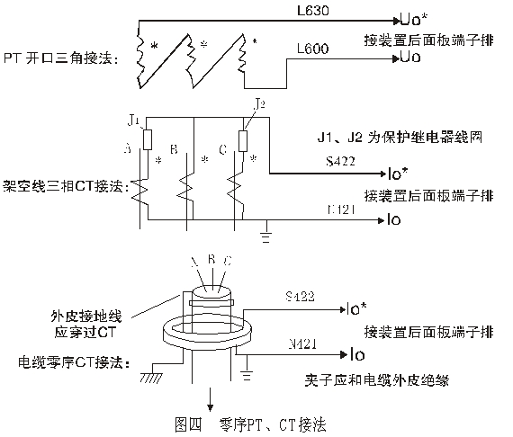 裝置需要引入各段母線的零序電壓信號(PT開口三角電壓)以及各條出線的零序電流信號(架空線采用三相CT接成過濾器形成,電纜線通常套裝零序CT),接線形式見圖四: