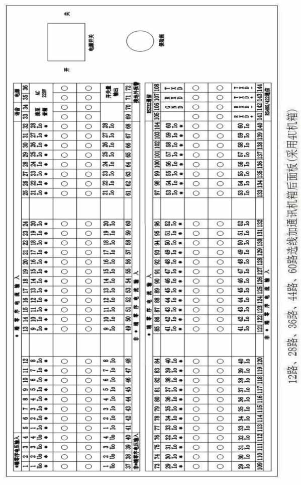 7.6.2 選用28路(含28)以下線路并帶跳閘功能的裝置,按4U機箱接線。選用29路(含29)以上至44路帶跳閘功能的裝置,按6U機箱接線。