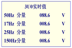 3、開機即顯示1段母線PT開口三角電壓4種頻率分量的有效值,也就是3分頻(17HZ)、2分頻(25HZ)、工頻(50HZ)、3倍頻(150HZ)的電壓分量有效值。通過菜單操作可以方便地查看其它測量值。