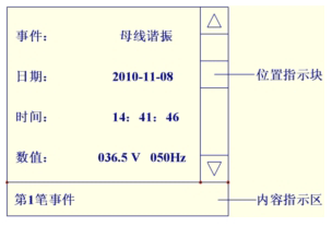 “紅色文字”表示光標所在位置。在第2屏下,按“UP鍵”或“DOWN鍵”移動光標,按“Fn鍵”退回上一級菜單,按“ENT鍵”進入所選擇的下一級菜單。選擇“事件記錄”并按“ENT鍵”進入“事件記錄”查閱頁面。如圖4: