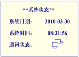 在第2屏下,按“UP鍵”或“DOWN鍵”移動光標,選擇“系統狀態”, 并按“ENT鍵”,可查看系統狀態,如圖5所示:本頁面顯示系統的實時時鐘和通訊狀態(若和上位機有通訊則顯示圖示的網絡標志,否則隱去)。按“FN鍵”退回上一級菜單。