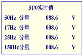 3、開機即顯示1段母線PT開口三角電壓4種頻率分量的有效值,也就是3分頻(17HZ)、2分頻(25HZ)、工頻(50HZ)、3倍頻(150HZ)的電壓分量有效值。通過菜單操作可以方便地查看其它測量值。