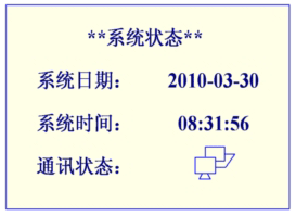 在第2屏下,按“UP鍵”或“DOWN鍵”移動光標,選擇“系統狀態”, 并按“ENT鍵”,可查看系統狀態,如圖5所示:本頁面顯示系統的實時時鐘和通訊狀態(若和上位機有通訊則顯示圖示的網絡標志,否則隱去)。按“FN鍵”退回上一級菜單。